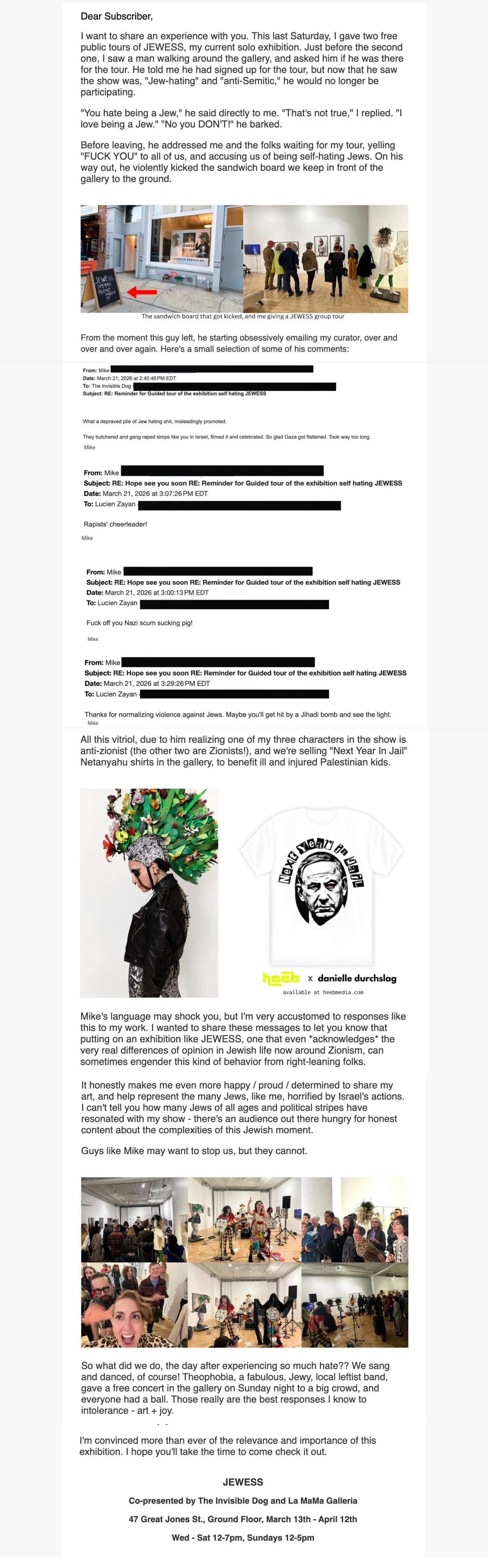 I’m sharing a recent newsletter below which describes a scary event that took place at JEWESS. This experience says so much, sadly, about this moment in Jewish life.