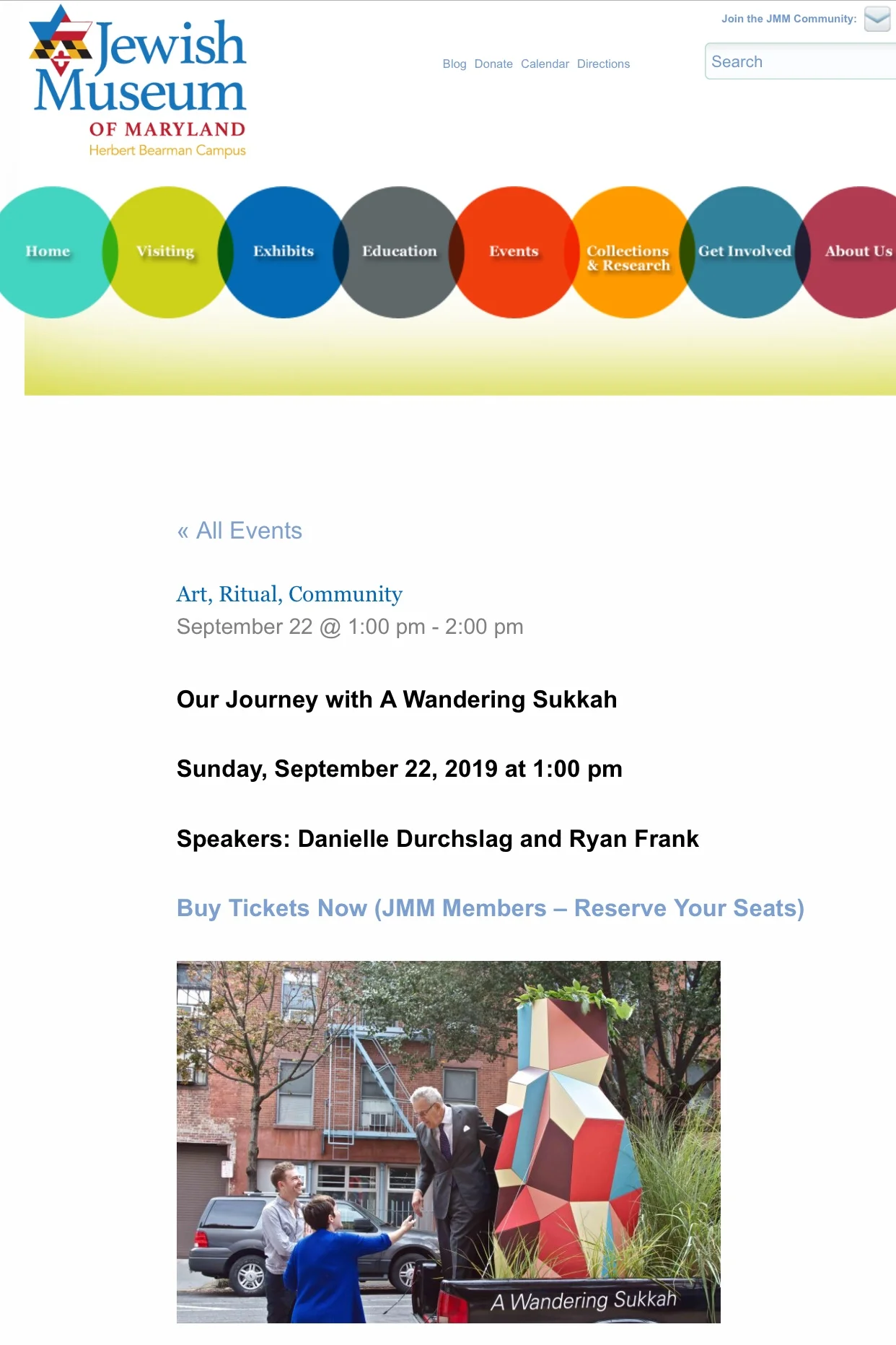 If you are in the Baltimore area on September 22nd, please join myself and Ryan Frank, my co-creator of A Wandering Sukkah, as we discuss our experiences making and touring this singular sukkah around NYC!