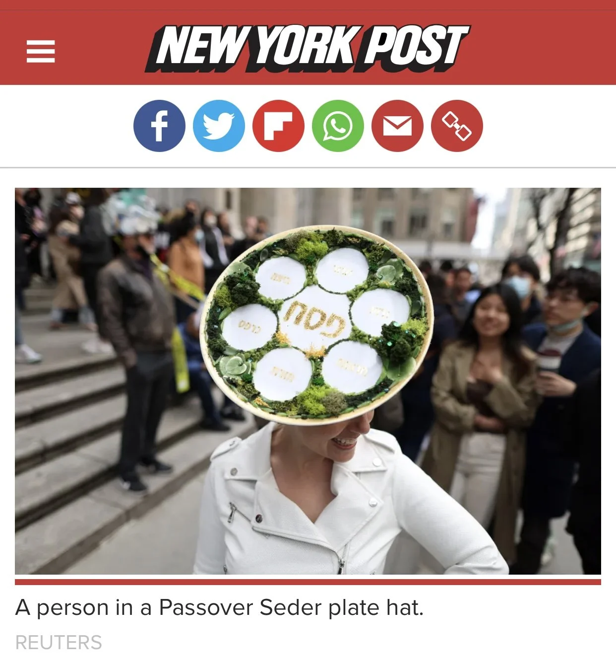 In 2022, on the same Saturday night, millions of Jews celebrated Passover (or Pesach), and on Sunday morning, millions of Christians celebrated Easter. To honor both, I created and wore a Seder bonnet for that year’s Easter Parade, a Seder plate fascinator. It was the only Jewish themed hat at the parade, and a joy to share.